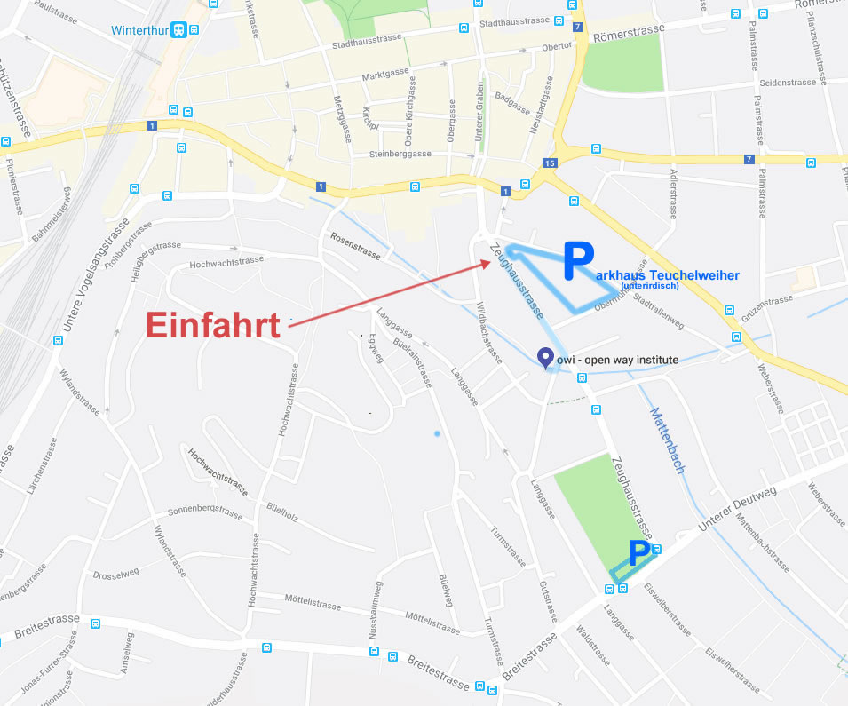 Nutzen Sie das öffentliche Parkhaus Teuchelweiher (250m ) oder das Parkareal am Ende der Zeughausstrasse/Unterer Deutweg, ca. 400m von uns.